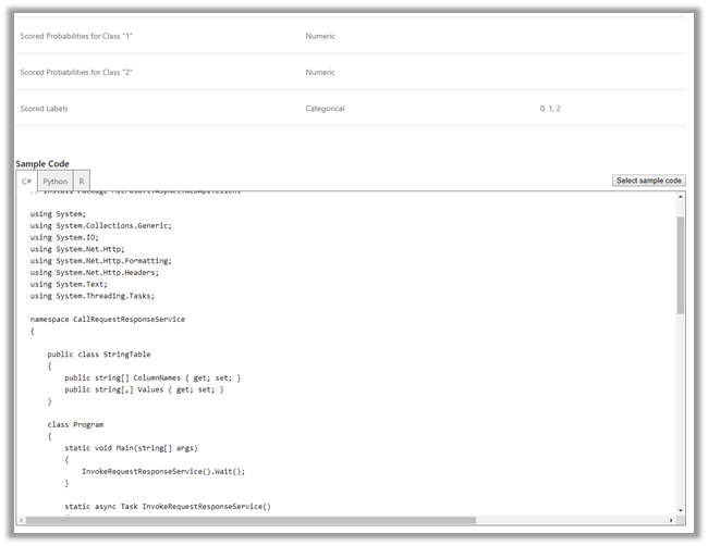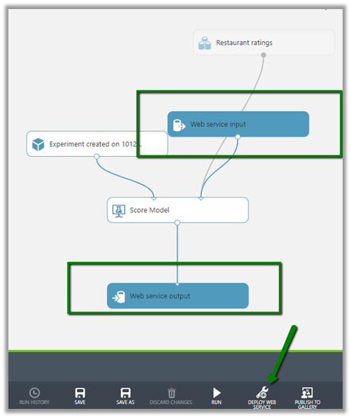 This adds the Web Service Input and Output module to our experiment. Run the experiment again and click on Deploy Web Service to deploy the service to Azure.