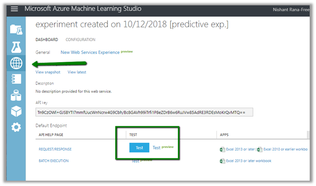 The successful deployment will open up the Web Service group and will list down the details of the web service deployed. We can click on “Test Preview” to test our model.