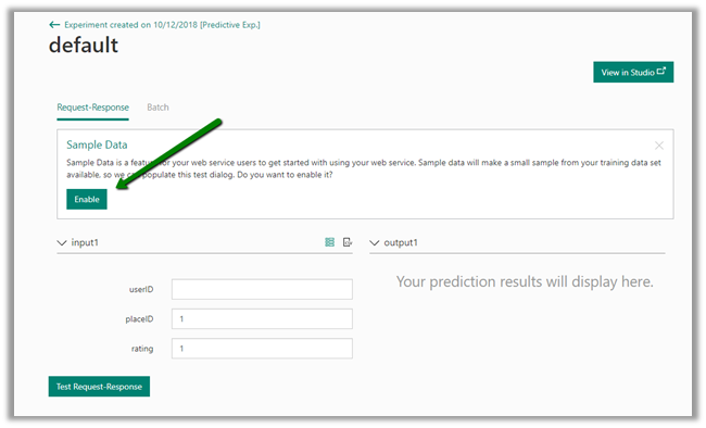 Click on Enable for the sample data inside the Test page, which will generate the sample data to be used as input for the web service.