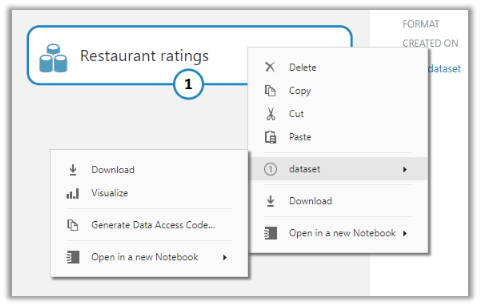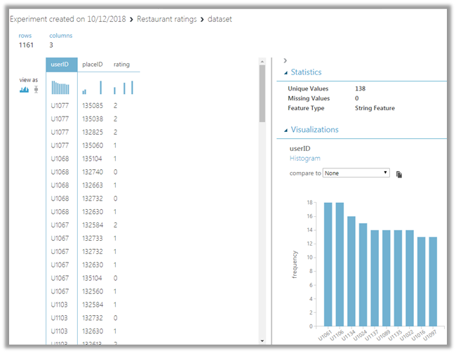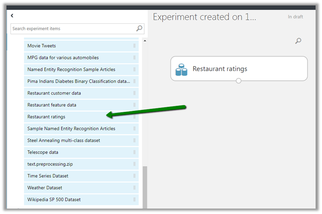 The first step involves specifying the DataSet, here we will be working with the sample dataset i.e. Restaurant Ratings already provided. Select and drag the Restaurant rating dataset in the experiment designer.