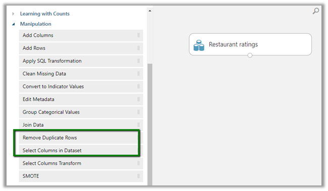Suppose our dataset includes a large number of columns or duplicate rows and we might not need all of them for our experiment we can make use of “Select columns in Dataset” module or to remove duplicate rows “Remove Duplicate Rows” module etc. by specifying them as the next step in our flow. Or can use any of the modules that is part of Manipulation section based on our requirement and the dataset that we are dealing with.