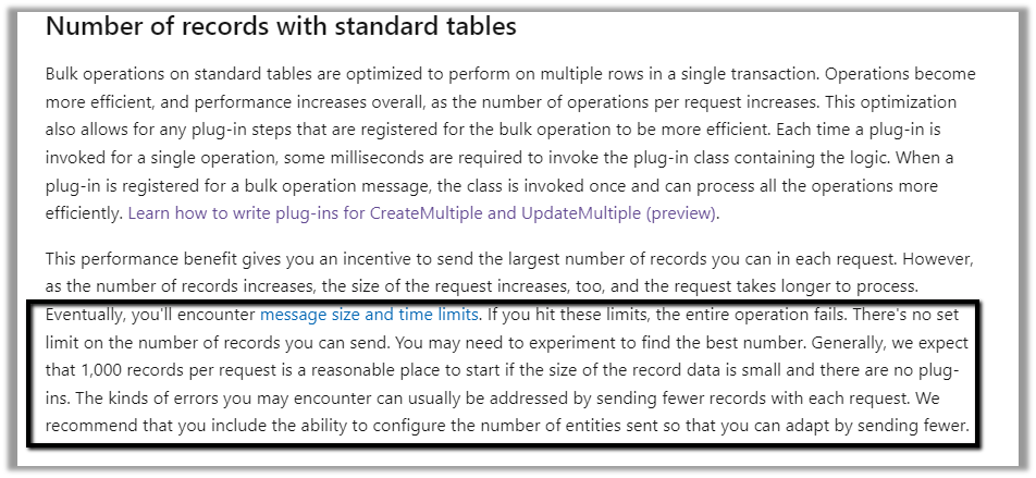 And in fact, now we can also write plugins against the CreateMultiple and UpdateMultiple messages. Get more details here