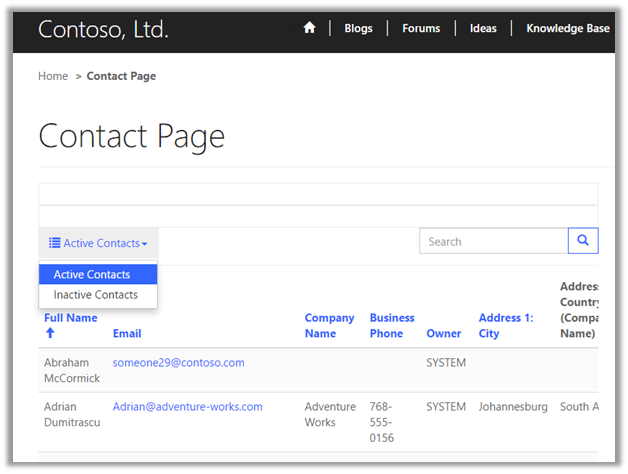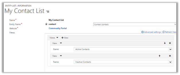 Let us take a simple example of showing Contact entity views in the Portal. Entity List can be used to show existing CRM View to the portal.