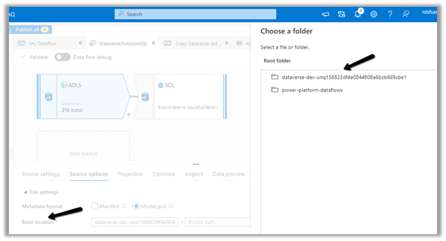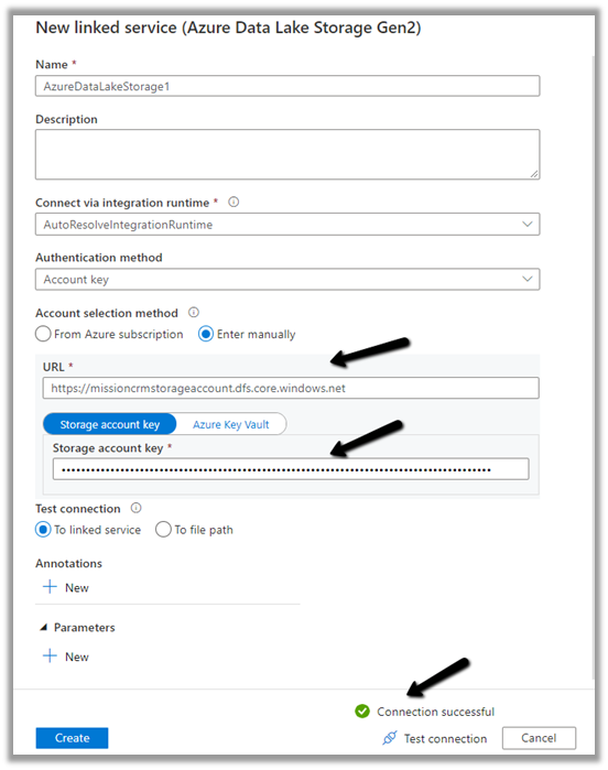 Similarly create a linked service to Azure Data Lake Gen 2, which holds our Dataverse data.