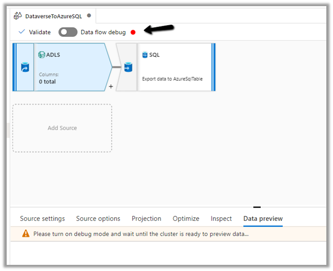 Here we have AzureSQLTable dataset connected to contact table in Azure SQL and have checked Allow schema drift option.