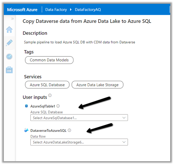 Let us specify the User Inputs required by the template – i.e. Azure SQL Database and the Data Lake Storage.