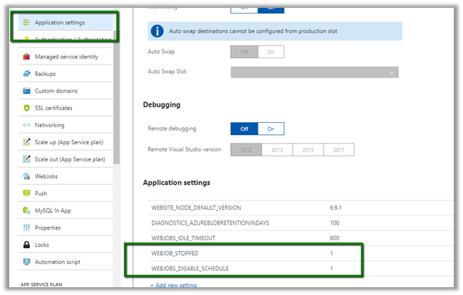 To do go to Application Settings for the App Service. Add WEBJOB_STOPPED and WEBJOBS_DISABLE_SCHEDULE setting with value 1.