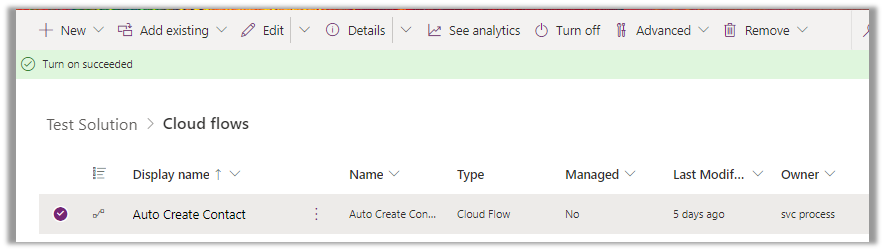 So we tried it on a trial environment first, below is our flow that runs every 5 minutes and creates a contact record (Dataverse), sends an email (Office 365 Outlook), and creates a file (SharePoint) owned by the same account along with the connection reference.