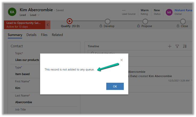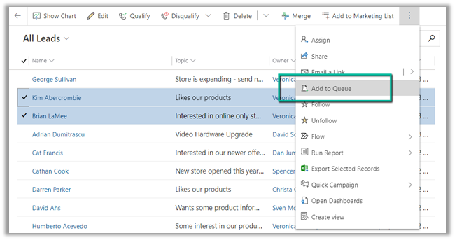 Say we want to add a particular lead record, here we can navigate to view for the lead or open an individual lead record and select the option Add to Queue