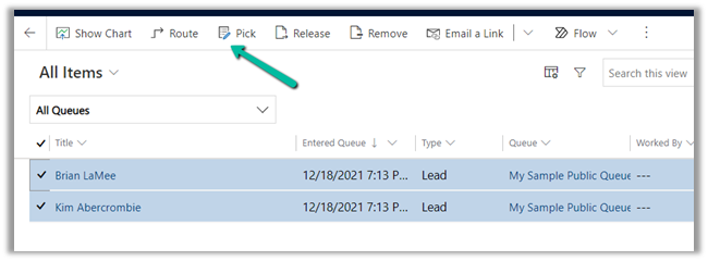 Let us change it to either All Items or Items available to work on and filter to either My Sample Public Queue, All Queues, or All Public Queues for the lead records / queue item to show up.