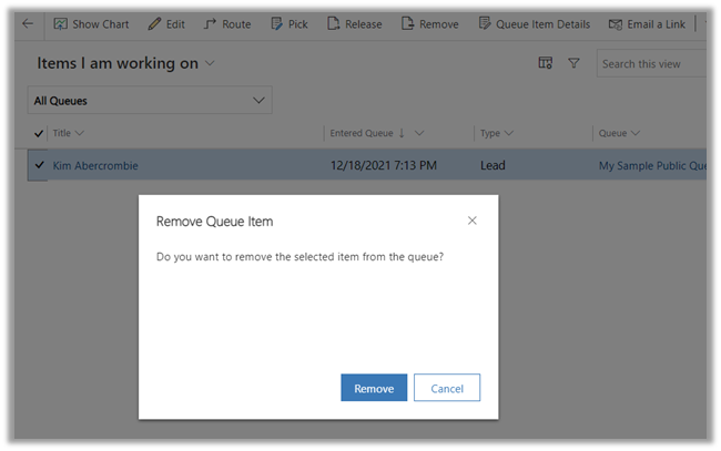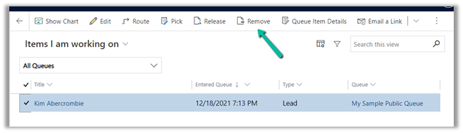 This Remove option removes the Queue Item (a lead record) from the Queue. (My Sample Public Queue) in this case.
