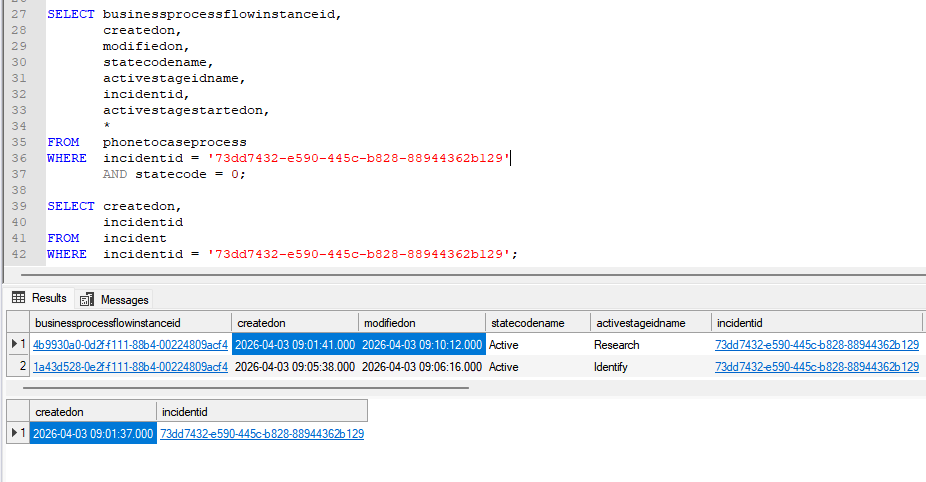 On further analysis, we observed a consistent pattern. One BPF instance was typically created at the time when the Case record itself was created. The second instance — usually the one with the most recent Modified On value — corresponded to the latest process applied.