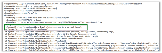 <a:value i:type=”b:string” xmlns:b=”http://www.w3.org/2001/XMLSchema”>Microsoft.Crm.CrmException: An unexpected error occurred. —> System.FormatException: Input string was not in a correct format.