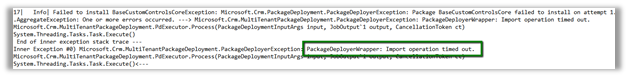 “Create new Organization (Name=46d256f4-1009-ea11-a2df-00505680070e, Id=FABUAECIBSIT) failed with Exception: System.Exception: Error.ActionFailed Microsoft.Crm.Tools.Admin.InstallPlatformSolutionsAction —> Microsoft.Crm.PackageDeployment.PackageDeployerException: Package BaseCustomControlsCore failed to install on attempt 1. System.AggregateException: One or more errors occurred. —> Microsoft.Crm.MultiTenantPackageDeployment.PackageDeployerException: PackageDeployerWrapper: Import operation timed out. at Microsoft.Crm.MultiTenantPackageDeployment.PdExecutor.Process(PackageDeploymentInputArgs input, JobOutput`1 output, CancellationToken ct) at System.Threading.Tasks.Task.Execute()