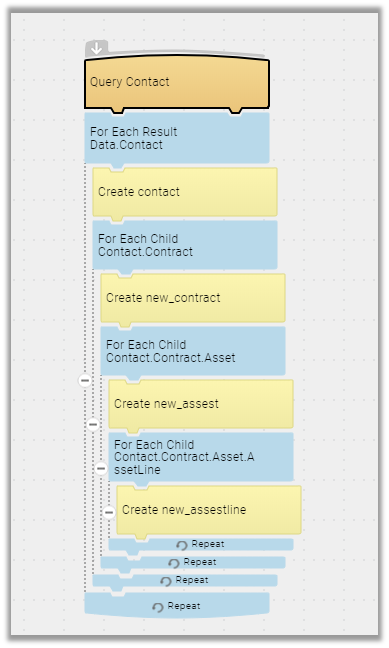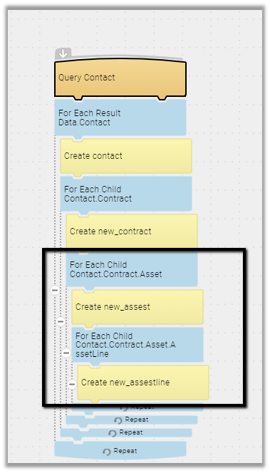 Repeat the same steps for remaining child entities like Asset and Asset Line by selecting the relationship in for each child block and in the next create step setting the fields appropriately.