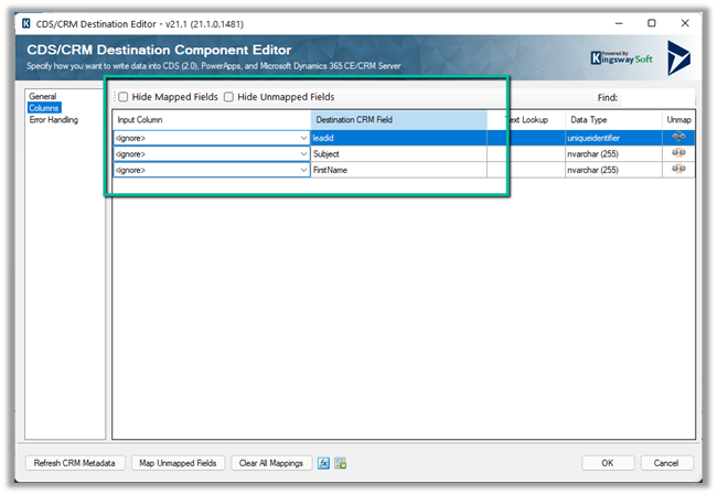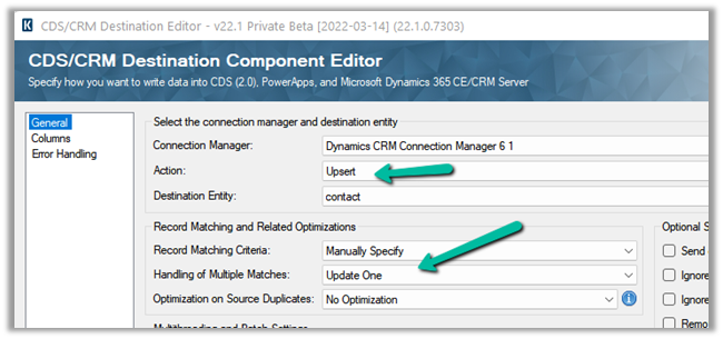 Finally, in the CDS / CRM Destination Component, we are performing an upsert using the dervied Mobile Phone Formatted derived column as a match.