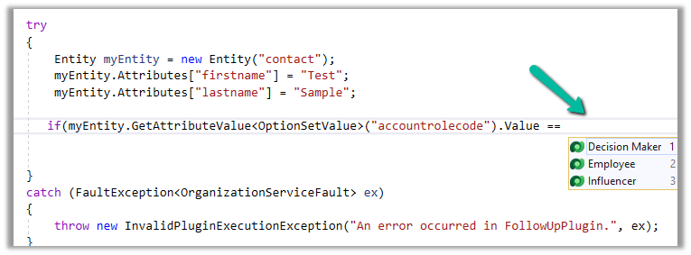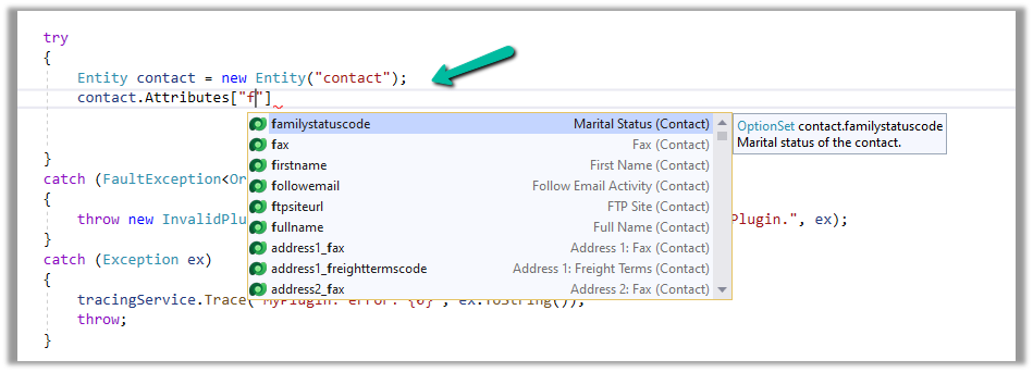 It also filters the suggestion based on the attribute or column type as shown below. We can see only the OptionSet type attributes being listed down.