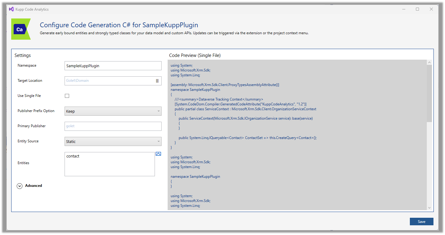 Developers can configure and quickly generate Early Bound Entities using the Code Generation feature of the tool.