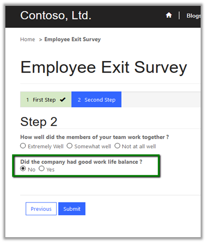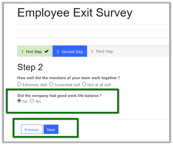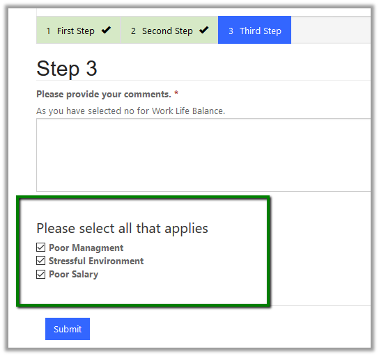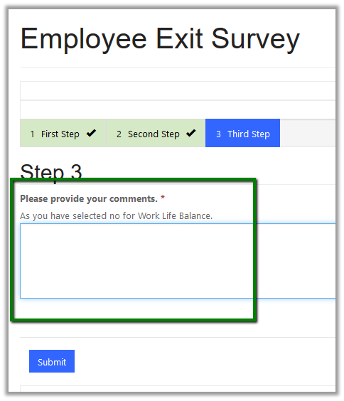 Here we’d add a conditional web form step which will check the response of the user for Work Life Balance question and in case if it false, it shows one more step to the user and asks for the comments.