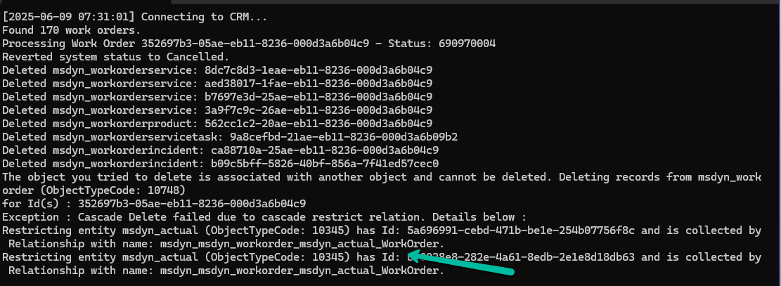Also, we had to temporarily change the Delete action to Remove Link from Restrict for the relationship between msdyn_workorder and msdyn_actual_workorder.