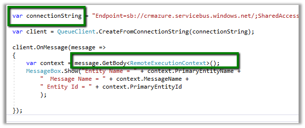 The source code for the queue. Here the connection string will be the same which we had specified in the plugin registration tool. The message body is of type RemoteExecutionContext.