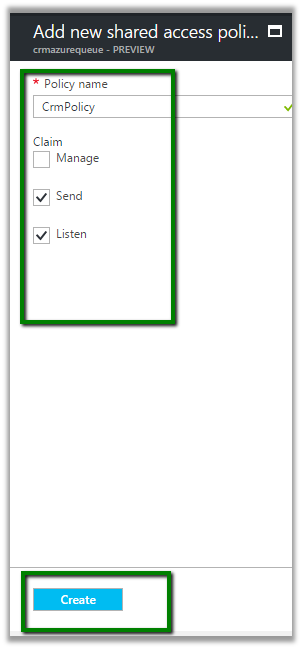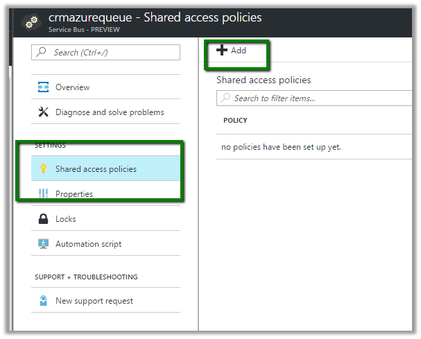 Next inside the queue we need to go to Shared Access Policy settings and click on Add button to add a new SAS Key