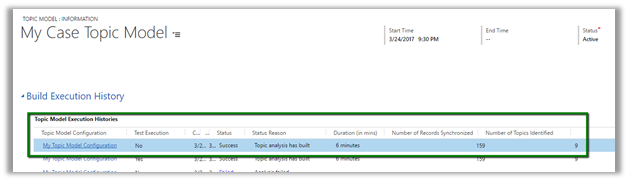 We can check the status of the build in the build execution history tab. Below record shows the build to be succeeded, duration it took i.e. 6 minutes, number of records it synchronized i.e. 159 and topics identified as 9.