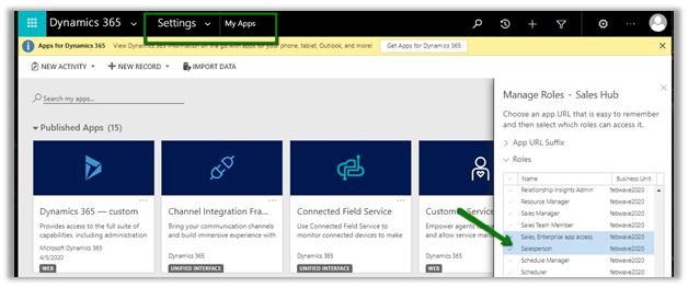 From the list of apps, select the App to be used. Here we clicked on the Sales Hub app.