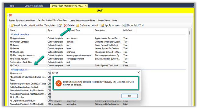 “Error while deleting selected records: SavedQuery My Tasks for otc 4212 cannot be deleted”