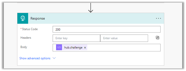 Lastly in Response, set Status Code as 200 and Body as hub.challenge.