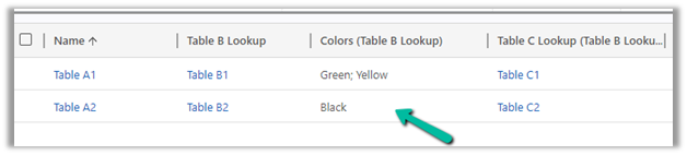 To get the Table C name, perform a Lookup on Table B, where Table B GUID is equal to Table A’s Table B lookup field, and then fetch the Table C Lookup’s name from Table B.