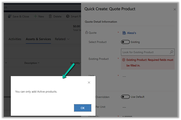 We will get a similar error from the application as well if we try adding a draft product as an existing product to either a quote product or an opportunity product.