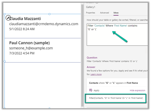 We saw the transformation of the natural language, now let us check the transformation of the examples to Power FX Formulas, for this let us select the fields inside the gallery.