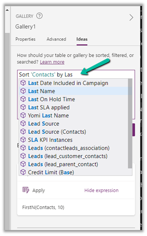 Let us first sort the contacts by Last Name. As we type we get the IntelliSense support.