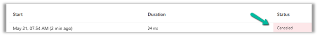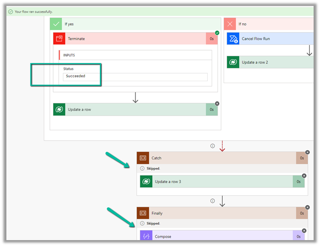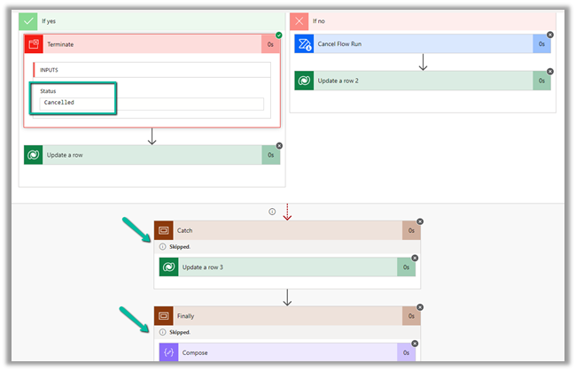 In the case of setting the Terminate Status as Failed – we see the next step skipped along with Catch and Finally.