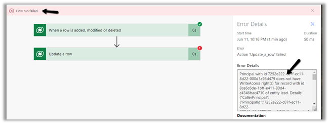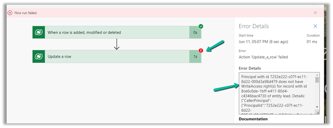 Principal with id 7252e222-c07f-ec11-8d22-000d3a98d479 does not have WriteAccess right(s) for record with id 8ce6c6de-1bff-e411-80d4-c4346bac4730 of entity lead