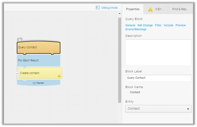 We have dragged the Query block from SQL Connection and selected the Contact table as the entity. Next, we add the For Each Result block and added the Create block from CRM Connection and selected the Contact entity for which we want to create records.