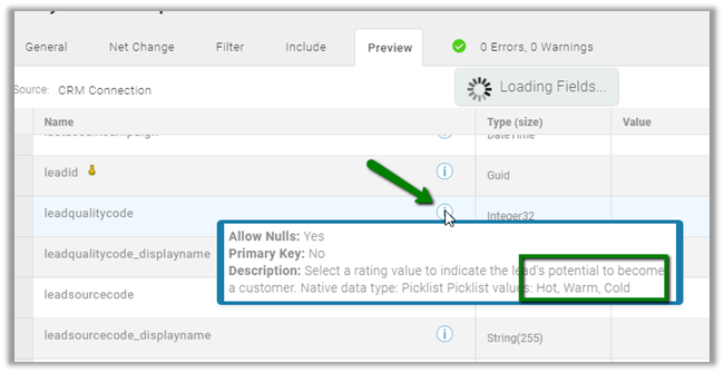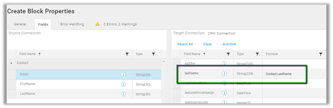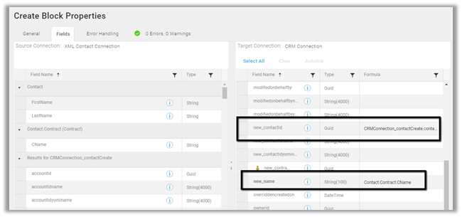 In the fields tab, drag the fields of the table to the corresponding fields in the Target CRM Connection.