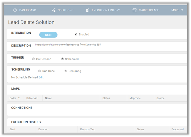 The solution screen provides the option to define the trigger for the Solution, it could be either on demand or can be scheduled to run once or on recurring basis.