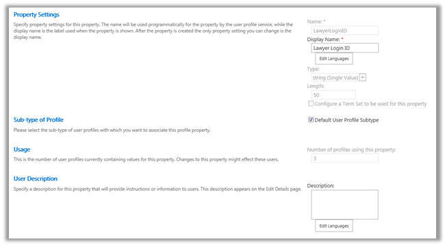 Create a new user property named User Login ID (Lawyer Login Id here in our case) that imports the value from SAMAccountName property of the AD. (Note: AD Profile Synchronization Connection should already be set up for the user’s profiles)