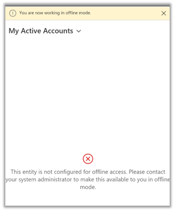 Navigating to the Account entity (which is not configured for offline) shows the below message.