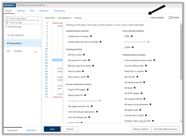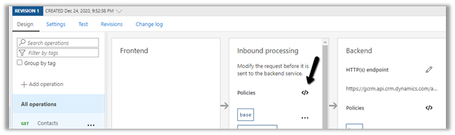 Select the GET operation, navigate to the Design tab and open the policy code editor for inbound processing