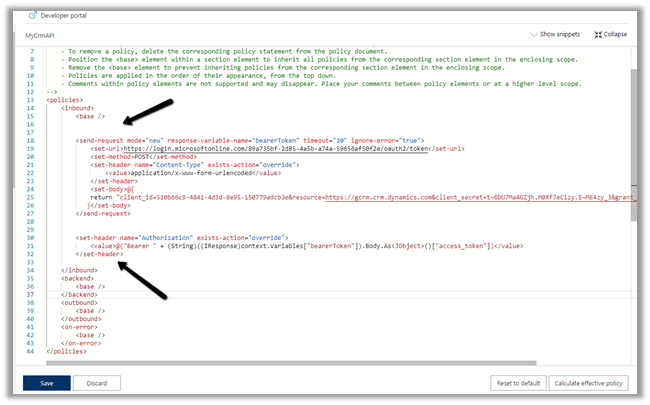 Here we would be defining send-request policy, to generate the Token and pass it in the Authorization header to the Dynamis 365 Web API request.