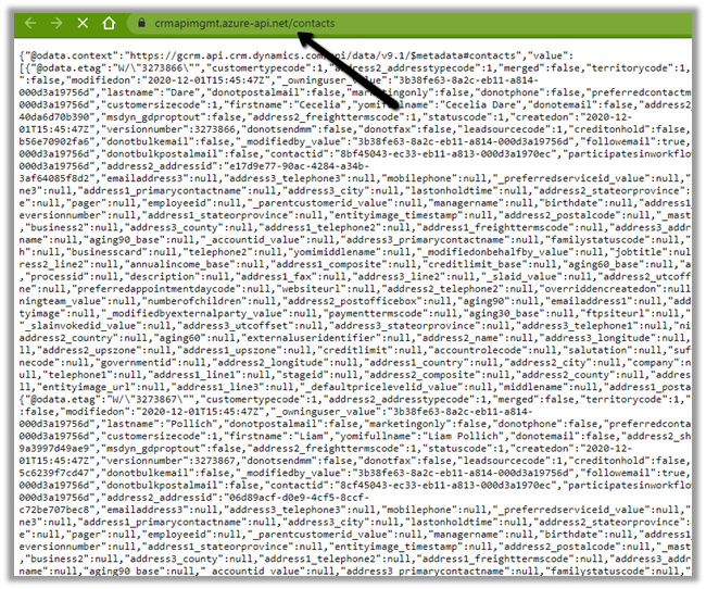 Specify the URL as shown below to fetch all the contacts from Dynamics 365.
