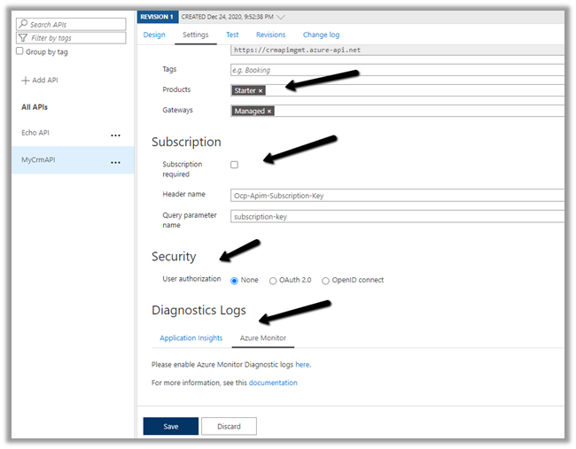 The other things that can be done are to associate the API with Products, specify Subscription, Security, enable Application Insights, Azure Monitor etc.